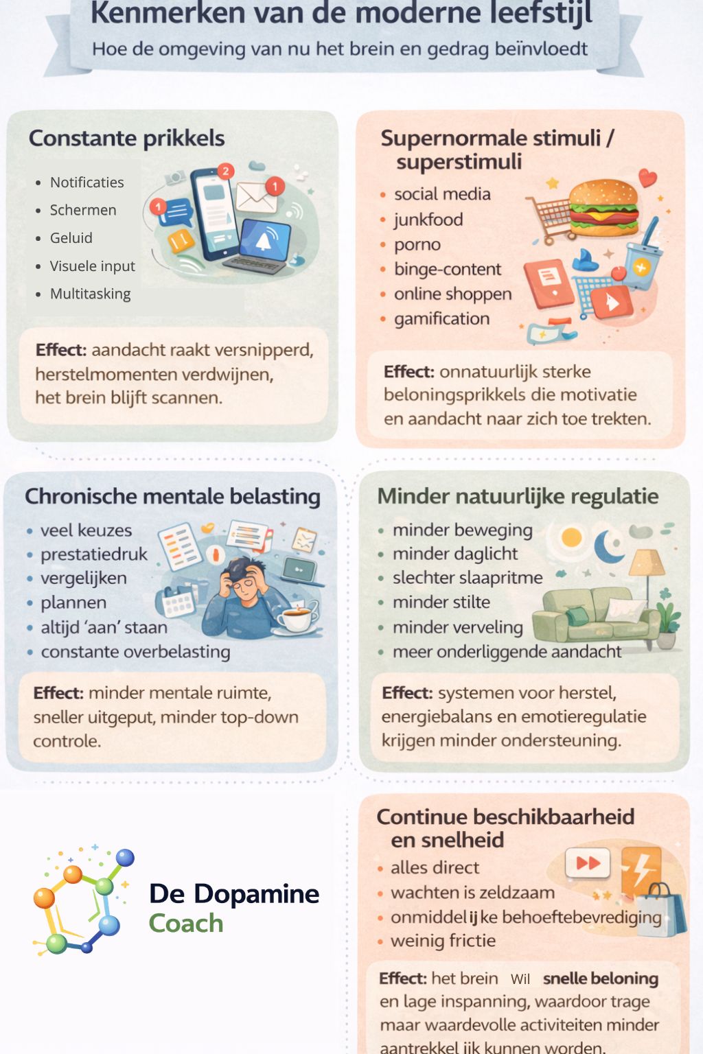 Deze afbeelding laat zien hoe de moderne leefstijl ons brein beïnvloedt. Door constante prikkels zoals notificaties, schermen en snelle beloningen raakt onze aandacht versnipperd en blijft het brein continu actief. Tegelijk zorgt chronische mentale belasting en minder natuurlijke regulatie (zoals beweging, rust en daglicht) ervoor dat herstel uitblijft. In combinatie met directe beschikbaarheid en snelle dopamineprikkels went het brein aan gemak en snelheid, waardoor focus, motivatie en energie voor diepere taken afnemen.