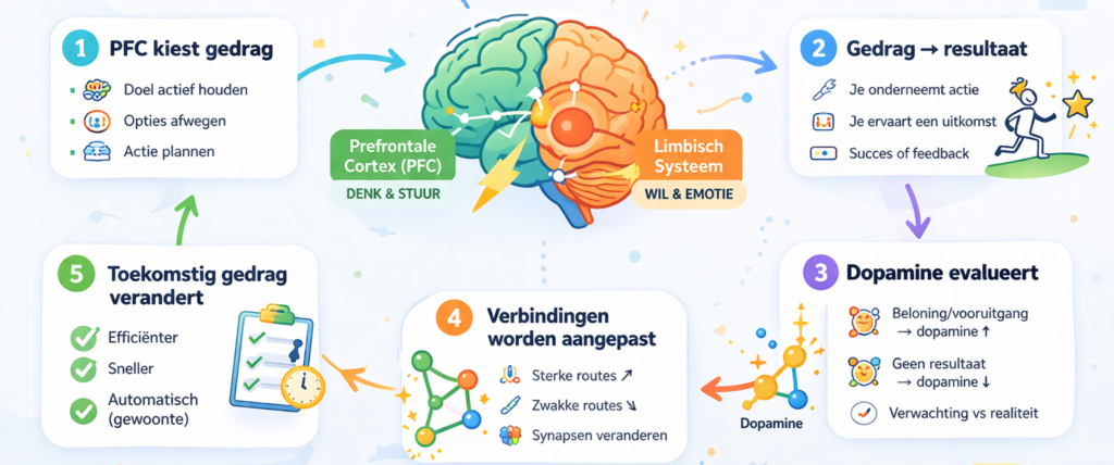 Wanneer de prefrontale cortex een doel vasthoudt, kiest zij in feite een gedragsroute. Stel dat iemand besluit: “Ik ga nu sporten.” De PFC helpt dan om aandacht, actie en prioriteit in die richting te organiseren. Na de actie volgt een uitkomst: misschien voelt iemand zich energieker, trotser of sterker dan verwacht, of juist teleurgesteld en vermoeid. Vervolgens komt het dopaminesysteem in beeld. Dopamine vergelijkt de uitkomst met de verwachting: was dit beter, slechter of ongeveer zoals gedacht? Juist dat verschil is belangrijk, omdat het het leersignaal vormt waarmee het brein gedrag aanpast (Miller EK, 2001).